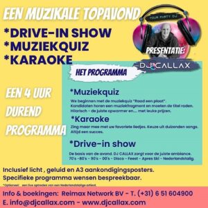 DRIVE-IN SHOW – Rode draad gedurende het programma en middag of avond. DJ CALLAX zorgt voor de juiste ambiance. 70’S-80’S-90’S-00’S-DISCO-FEEST-APRES SKI EN NEDERLANDSTALIG. Verzoeknummers zijn welkom.