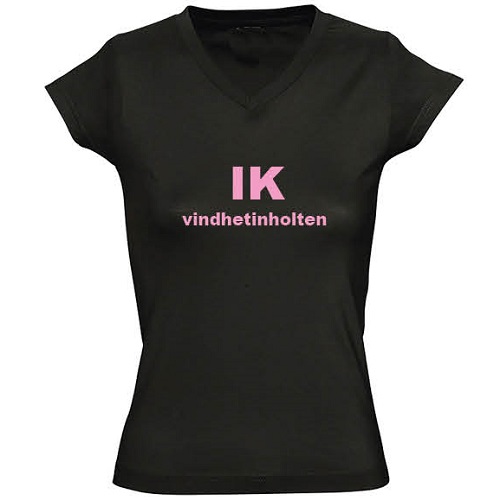 Dames T-shirt met bedrukking ‘IK vindhetinholten’ V hals zwart