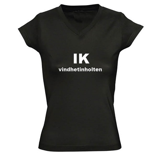 Dames T-shirt met bedrukking ‘IK vindhetinholten’ V hals zwart